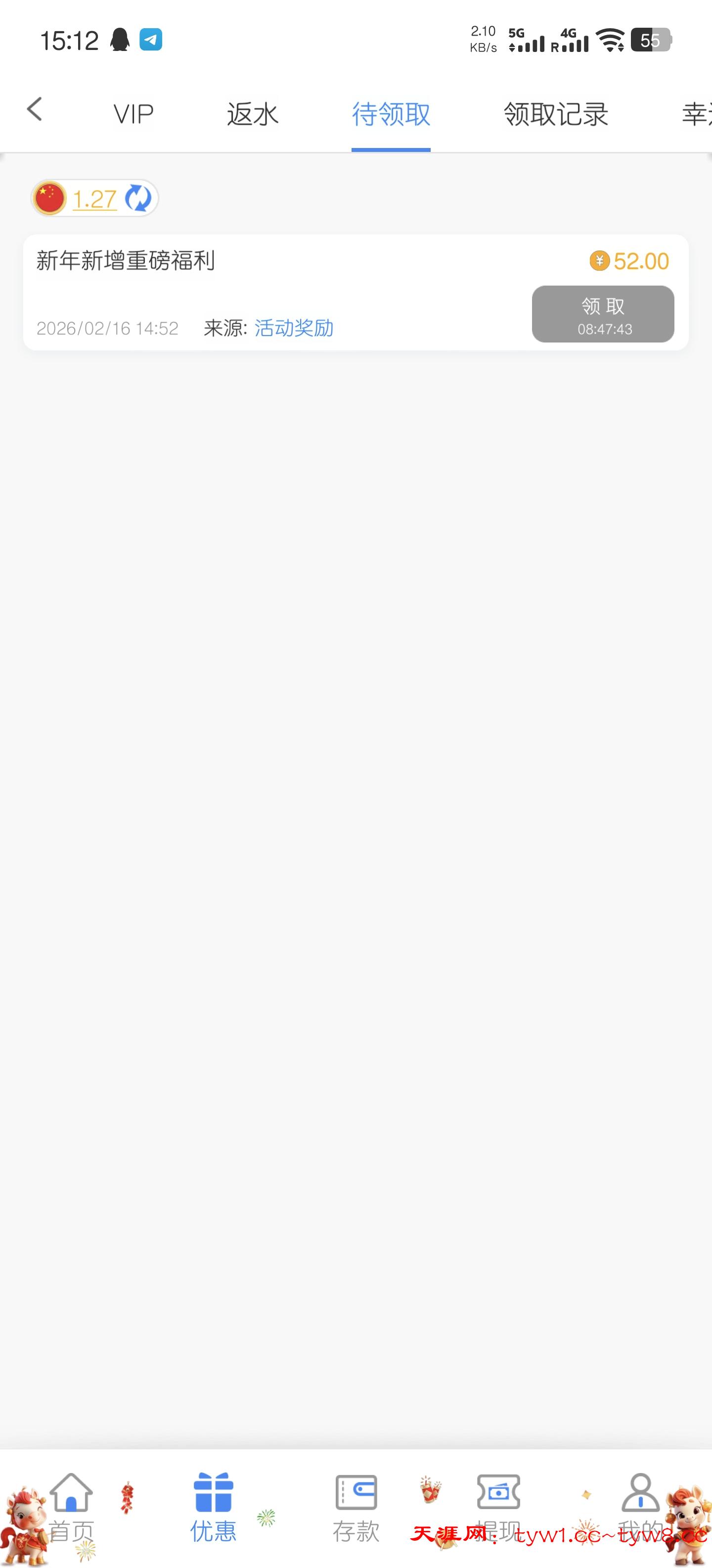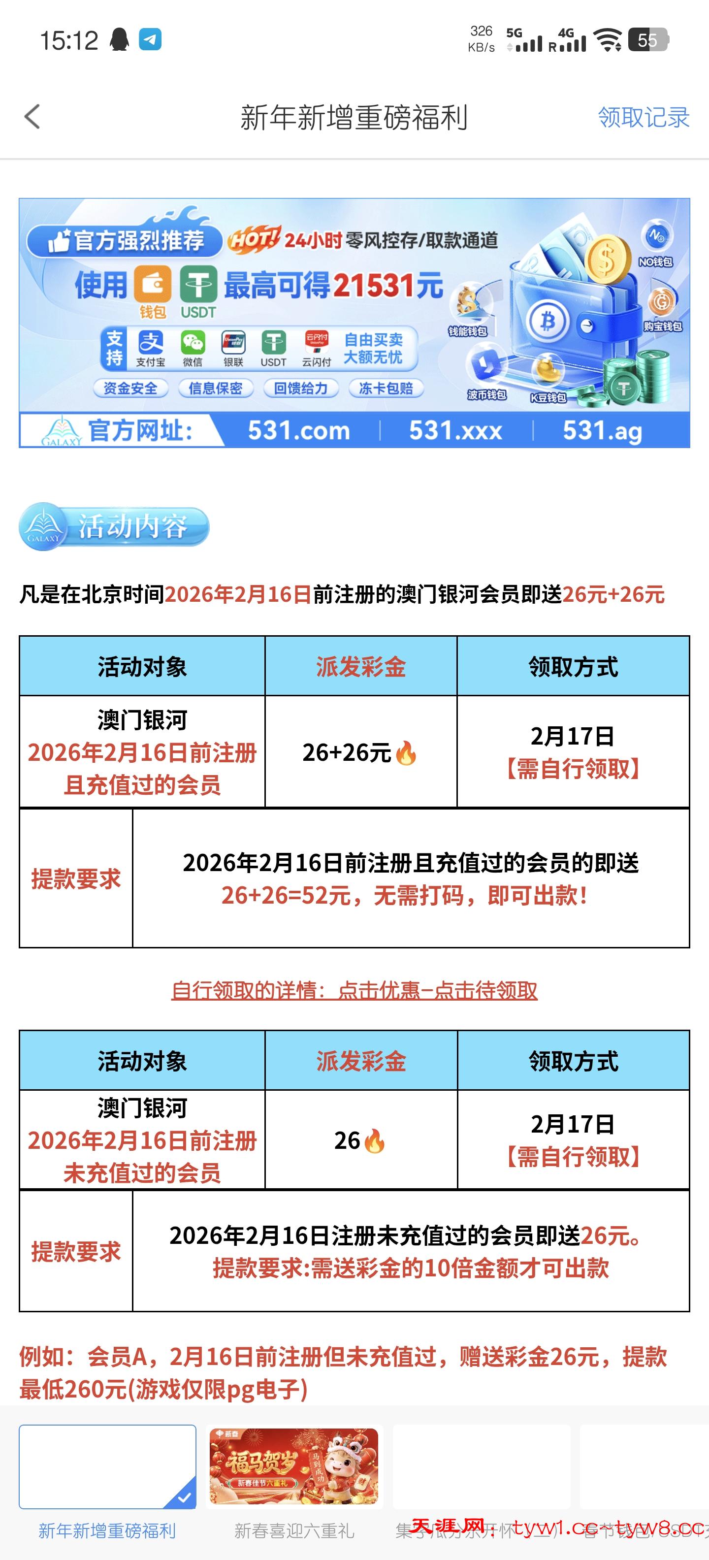 531澳门银河新年活动,16号之前有充值能领52直接提,无充值的也能领26打10倍流水。