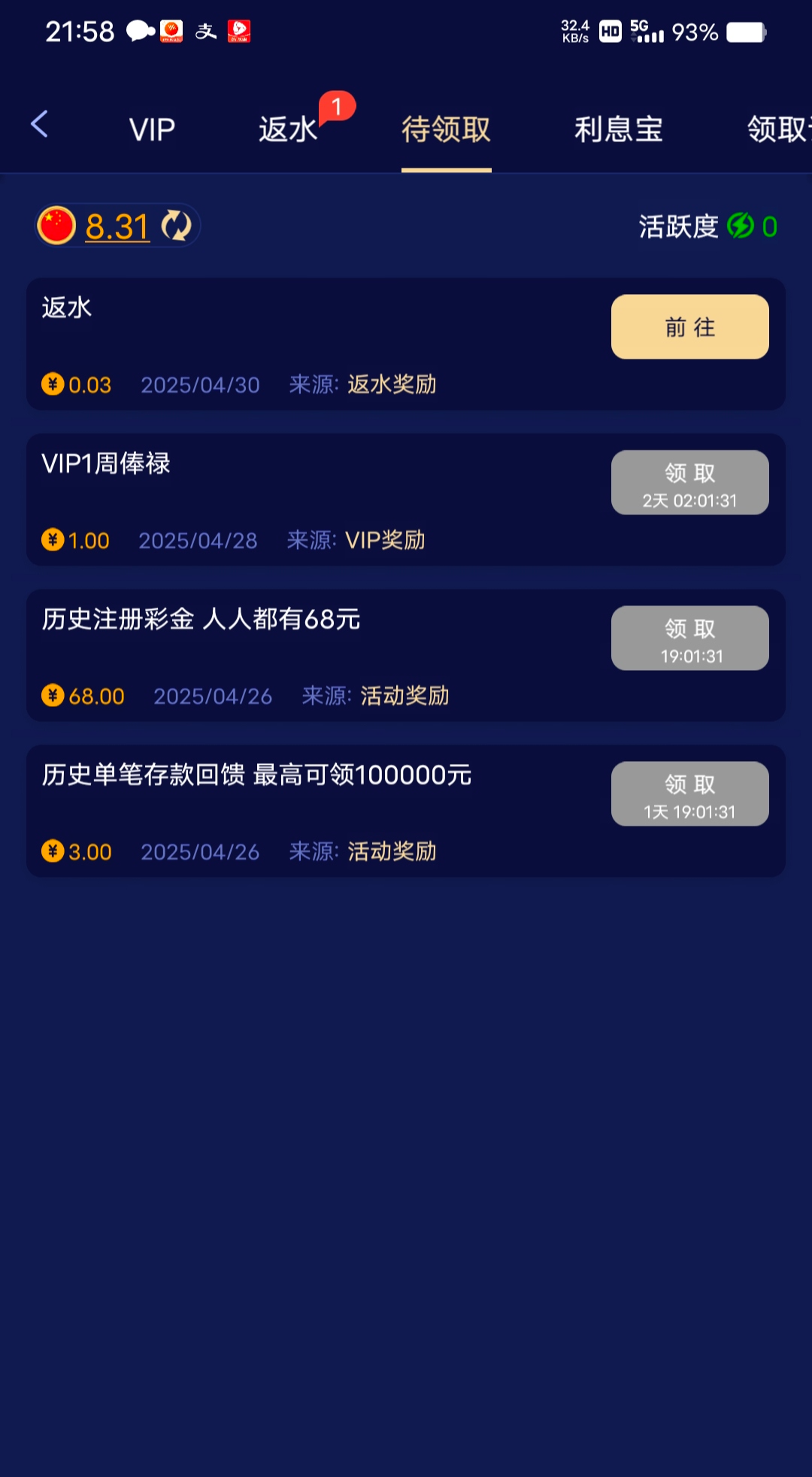 有号的冲过的,么充的也看看。明天领68