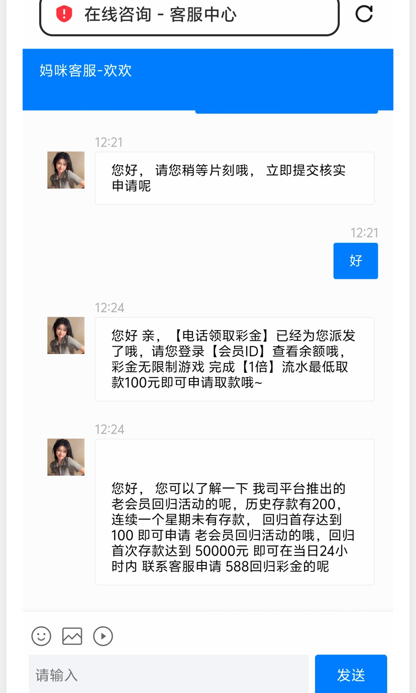 妈咪直播~客服可可17:50您好 您提供的手机号码并未存在本月回访名单内,请您提供存在名单的号码进行查询谢谢
