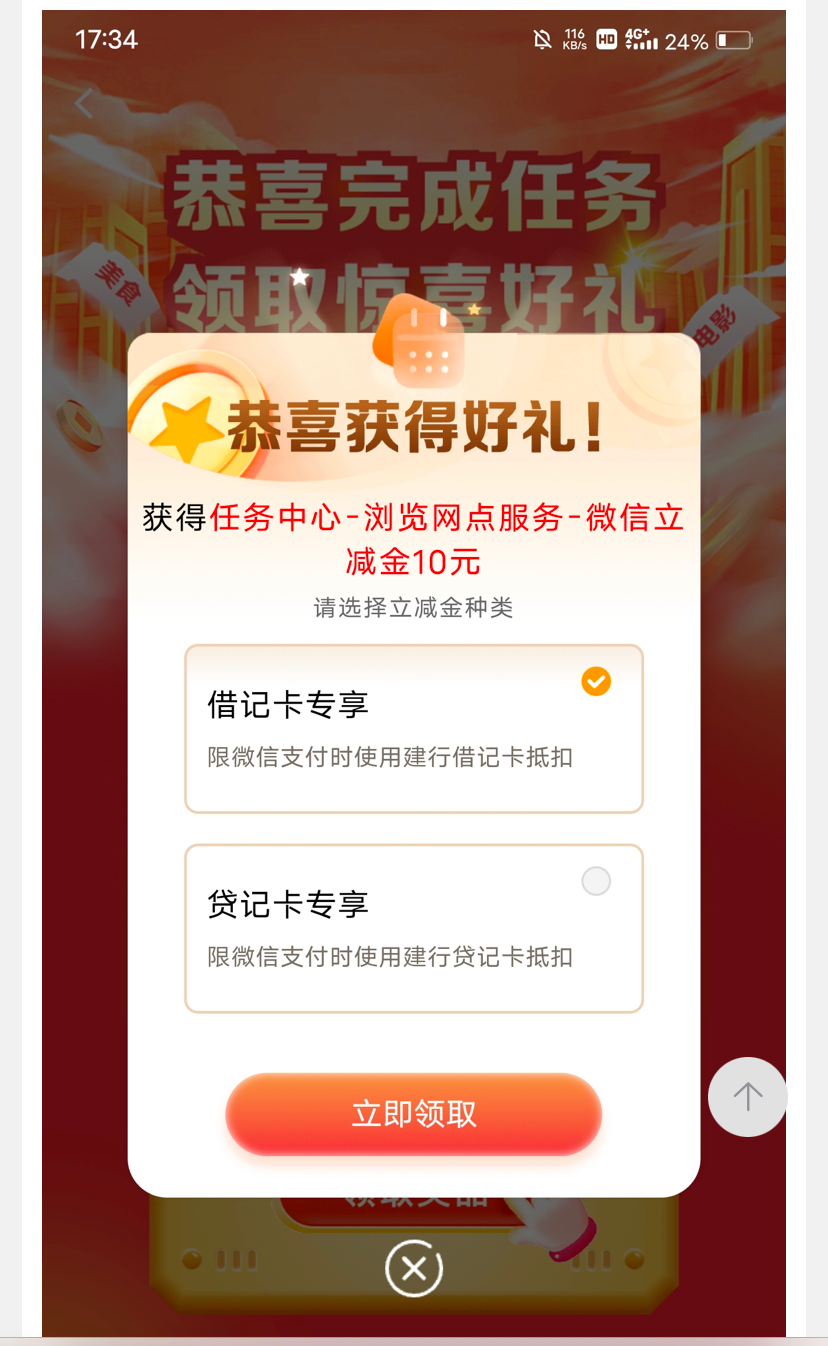 建设银行任务中心这个抽奖 我圈起来了,完成这个浏览任务,直接抽,很多人抽中10立减金,我自己刚中10立减金