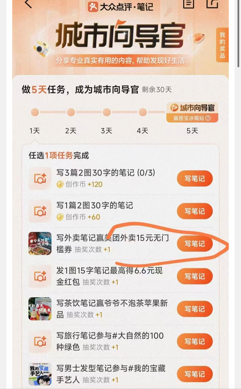 ①大众点评搜 城市向导官 写一笔笔记,2图,50字随便写,目前应该是必中15亓无门槛外卖券,发完帖子,过一会儿就审核通过了,抽奖往下滑一下就能看到,别眼瞎,必须安排自己猪逼饭
