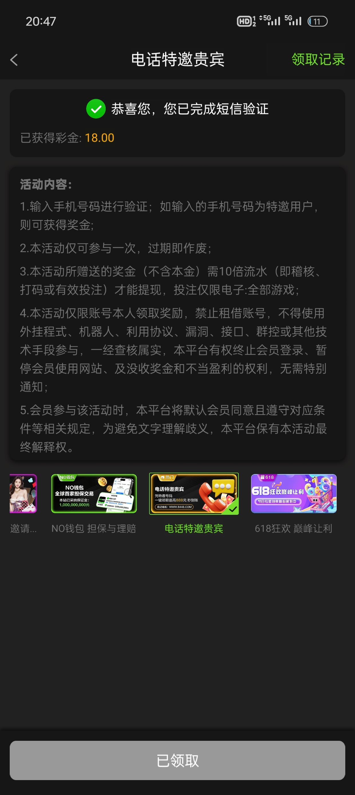 接到电话特邀注册短信验证送18